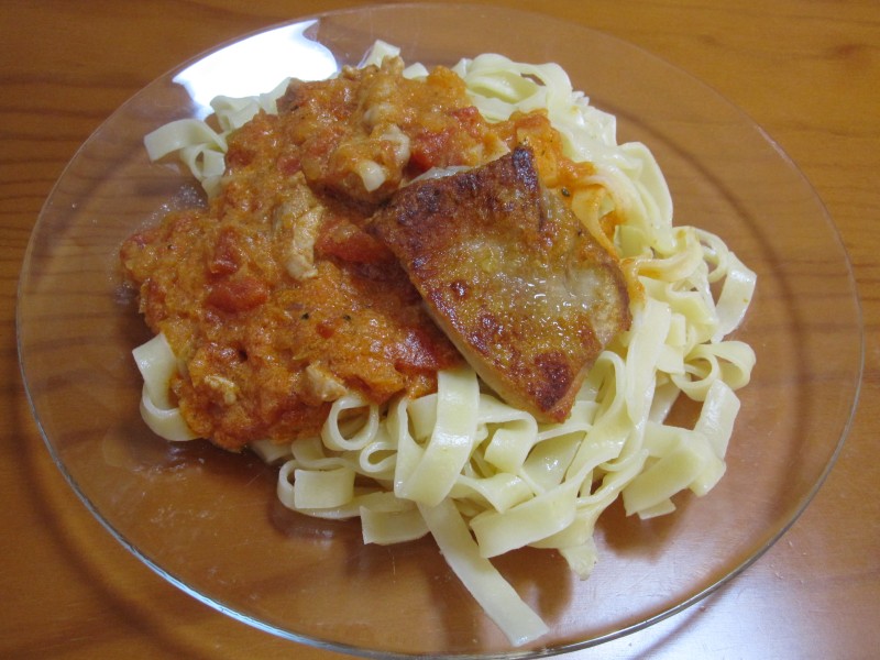 ↑トマトソースのフェットチーネ。カリッと焼いた鶏肉トッピング。