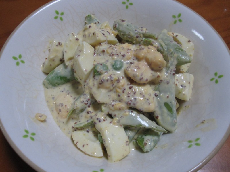 ↑スナックエンドウとゆで玉子のマヨマスタードあえ。