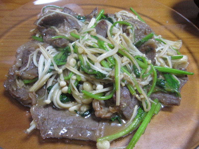 ↑牛肉・えのき・ほうれん草の炒め物。