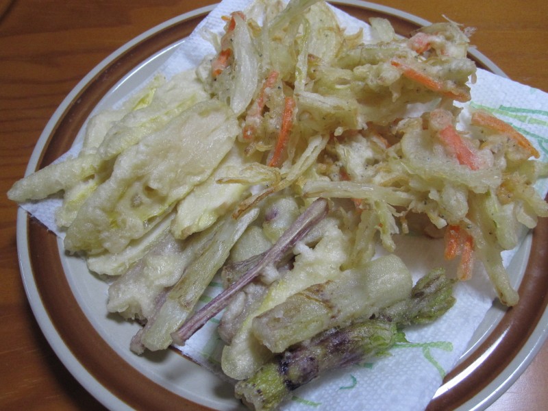 ↑下からもらった、かきあげ・タケノコ・うどの天ぷら。