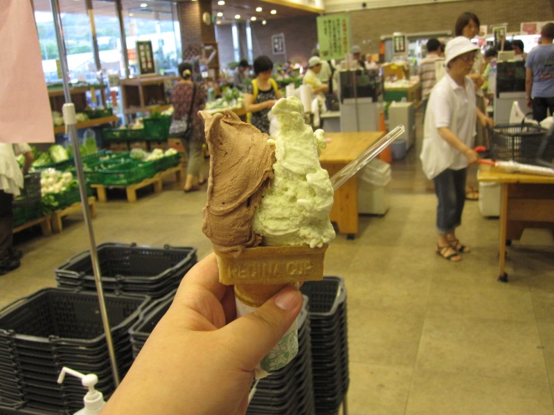 ダブルコーンで、左がチョコラータ、右が期間限定のそらまめ。