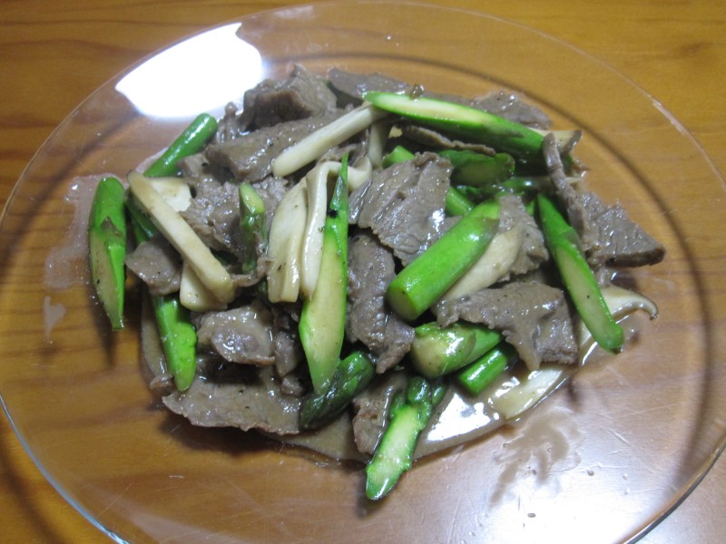 ↑牛肉・エリンギ・アスパラの炒め物。夫の人に好評。