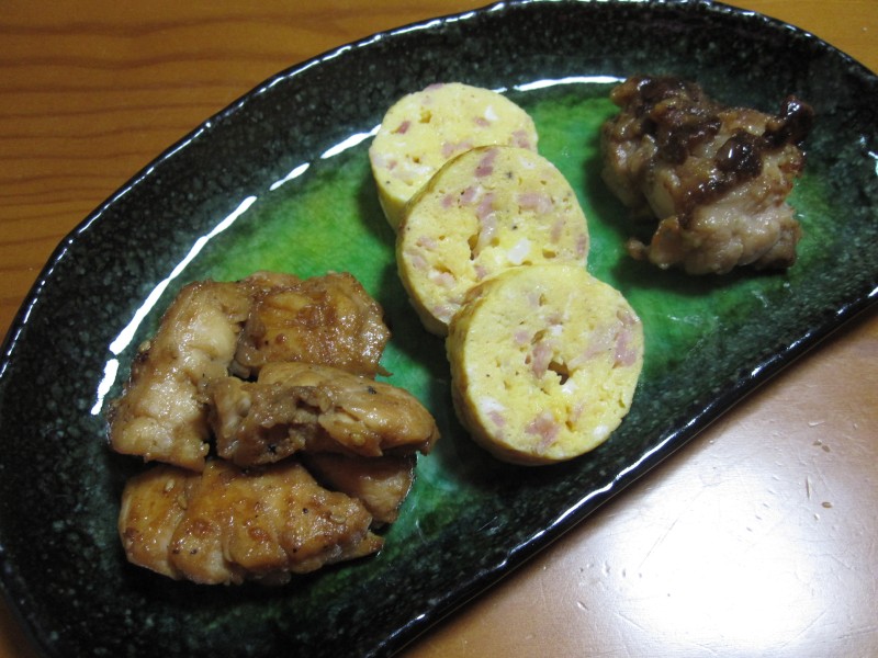 鶏ささみ中華焼き・ベーコンオムレツ・昨日の残りの肉。