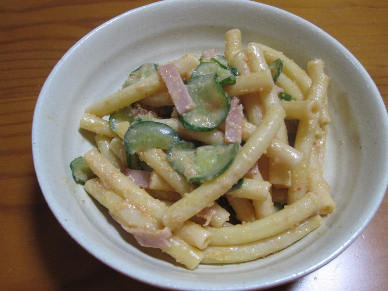 ↑マカロニサラダたらこソースあえ。昨日のサラダの残りも混ぜた。