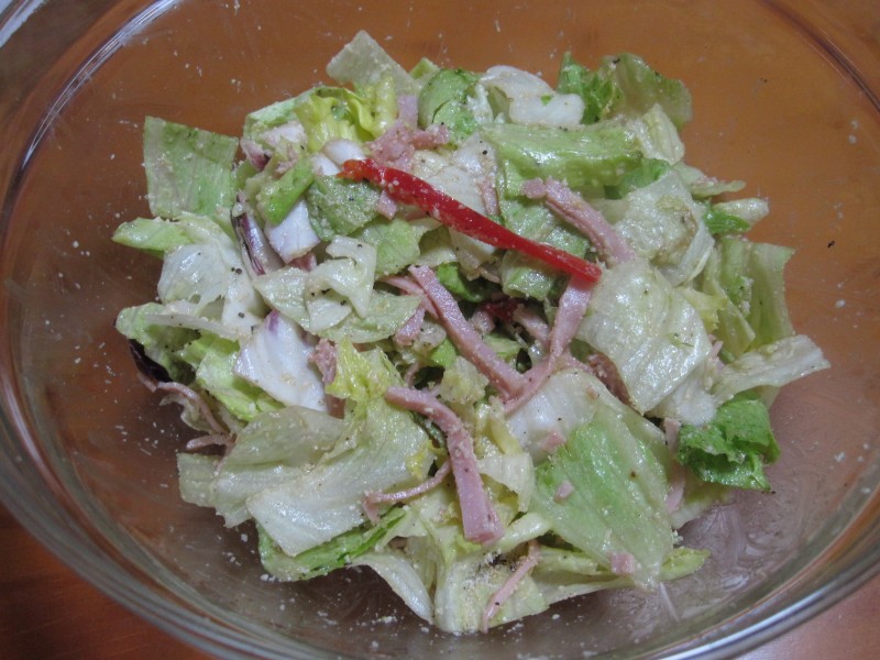 ↑下からもらったカット野菜に、ハムと粉チーズを混ぜたサラダ。