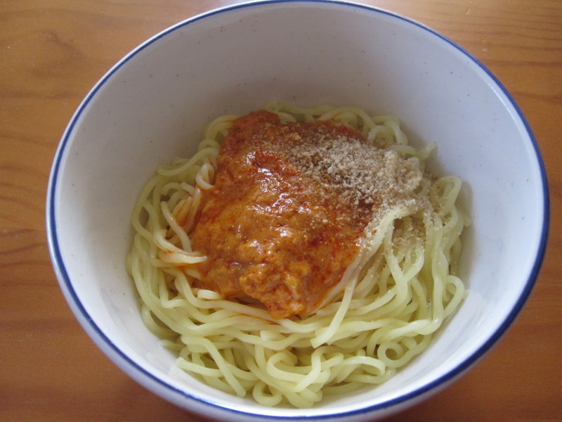 麺を茹でて冷水で洗って氷で冷やせとか書いてあるんだけど、氷は省略。