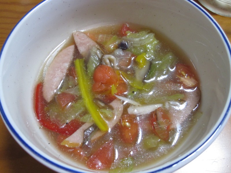 ↑野菜とウインナーの冷製スープ。