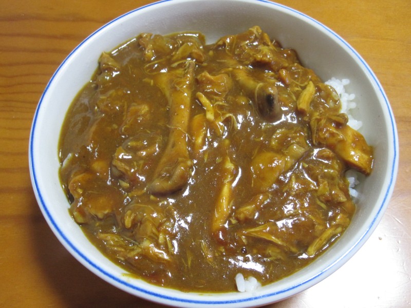 カレールーを入れて混ぜたら、肉が全部骨からほどけちゃった。