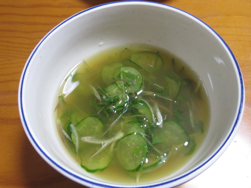 ↑冷汁っぽいもの。庭でつんだ大葉・キュウリ・みょうが入り。