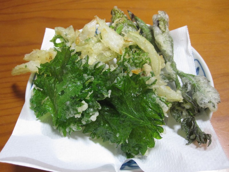 ↑下からもらった天ぷら。庭の大葉・野菜かきあげ・タラの芽。