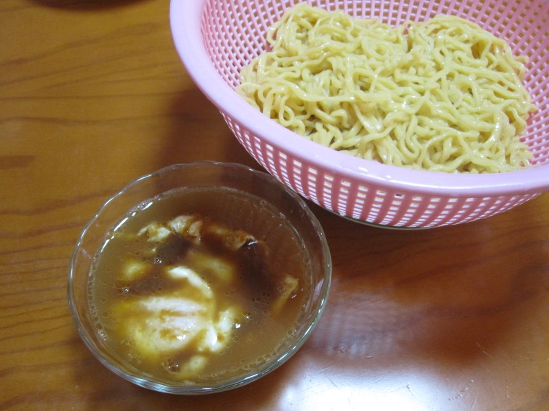 ↑朝ご飯は、つけ麺。つけ汁の中には、フライドエッグが沈んでいる。