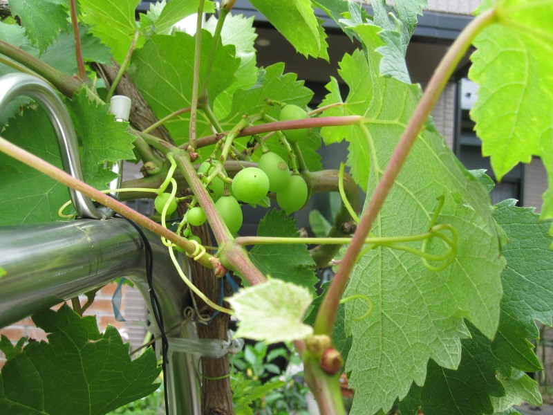 ↑玄関先で、お義父さんが育てているブドウ。実がついてきている。