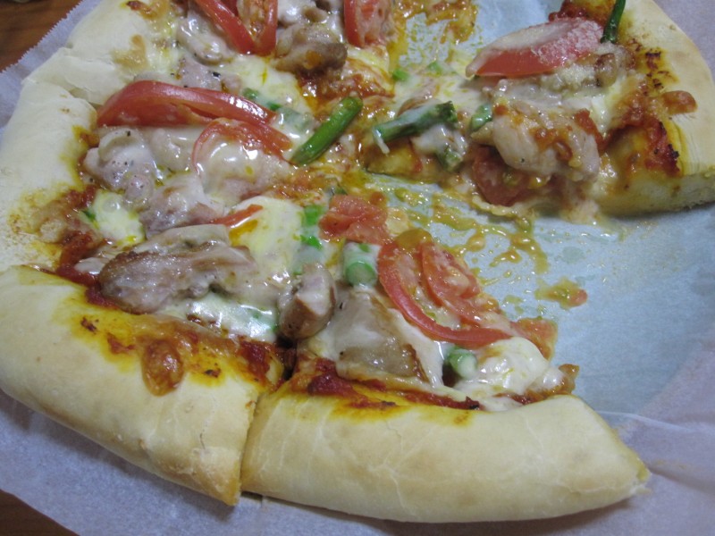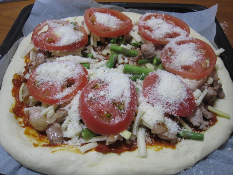 ↑トマトソースをぬって、アスパラ・鶏肉・チーズ・トマトをのせて。