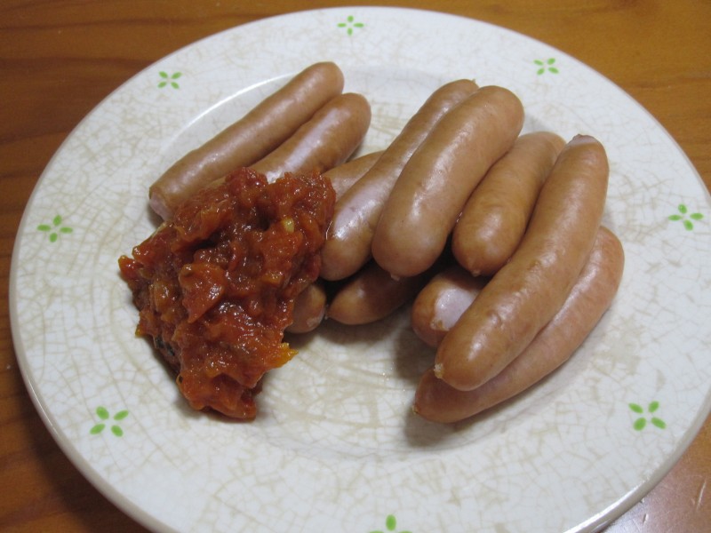 ↑ウインナー。昨日のピザに使ったトマトソースの残りをつけて。
