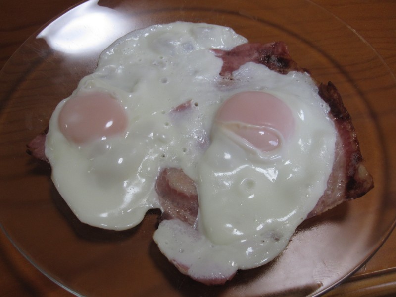 ↑ベーコンエッグ。夫の人と2人で半分こ。