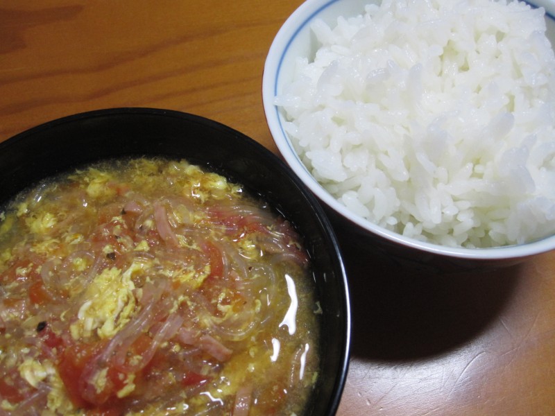 ↑夜ご飯。春雨トマト玉子スープ・ご飯。スープ、夫の人に好評。