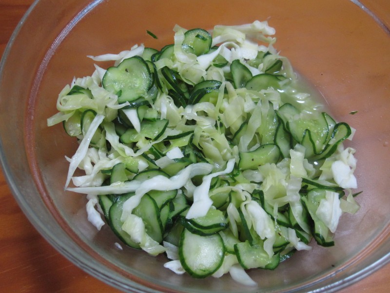 ↑キュウリ&キャベツのサラダ。昨日の残り。