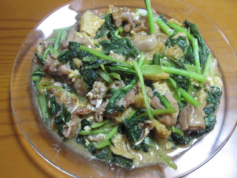 ↑小松菜・油揚げ・鶏肉の炒め物。うまうま。夫の人に好評。