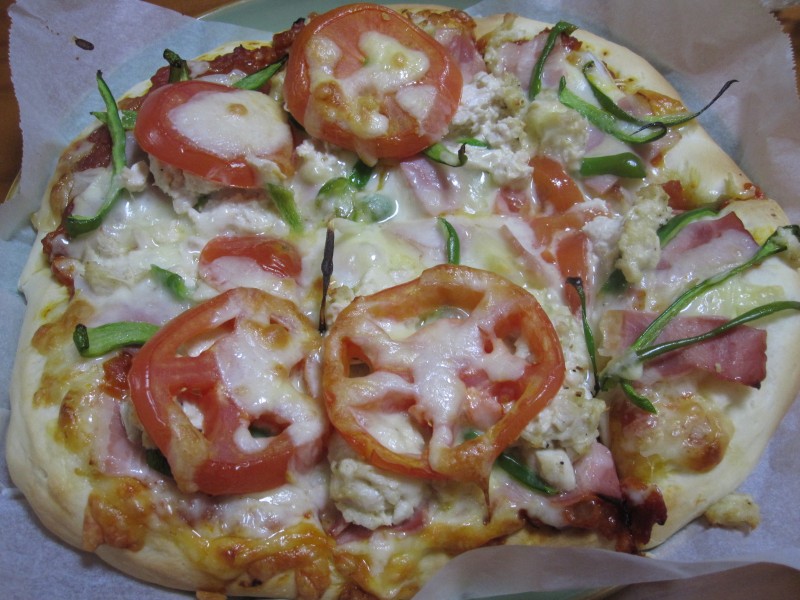 夫の人の作るピザは、具をのせる前に生地にぬるトマトソースがうまい。