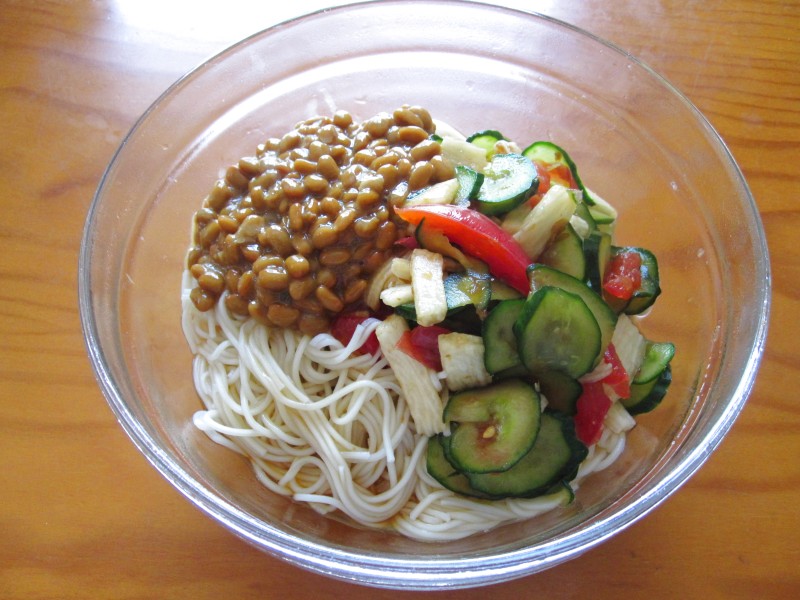 昨日食べるのを忘れていたサラダの残りと、納豆をのっけて。