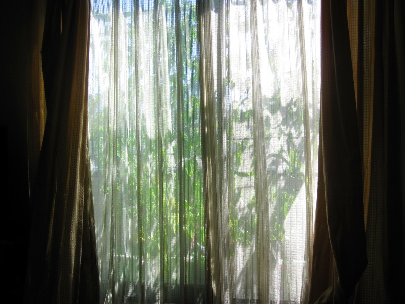 レースのカーテン越しに、木漏れ日のようなゴーヤの影。いいねぇ。