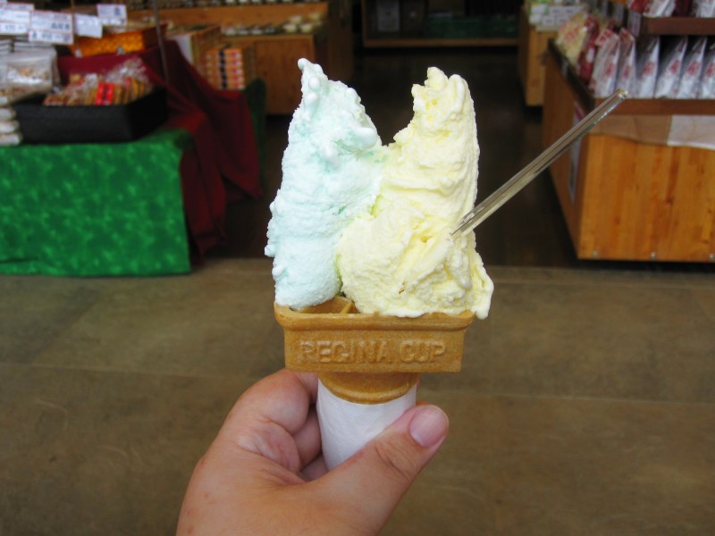 ↑塩ジェラート(左)と、期間限定のとうもろこし(右)。