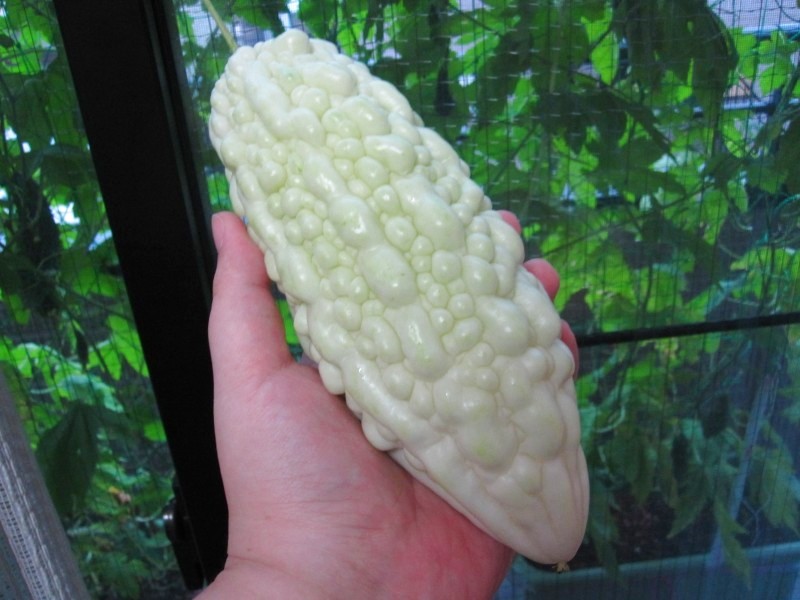 ↑白いゴーヤを収穫。長さは20cmくらい。