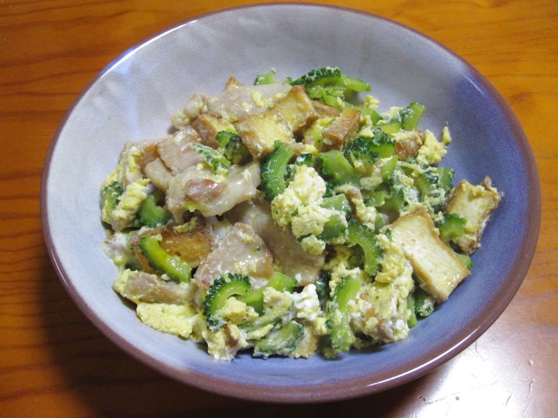 ↑夫の人が作った、ゴーヤチャンプルー。戦利品の豚トロ、大活躍。