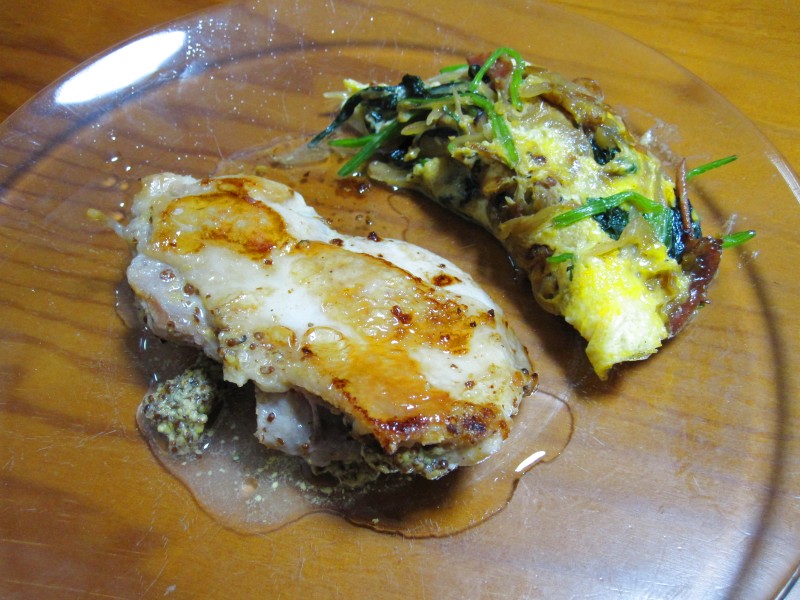 ↑野菜オムレツっぽいもの&鶏肉のマスタード焼き。