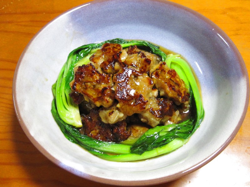 ↑レンコンと豚肉の団子、チンゲン菜あんかけ。