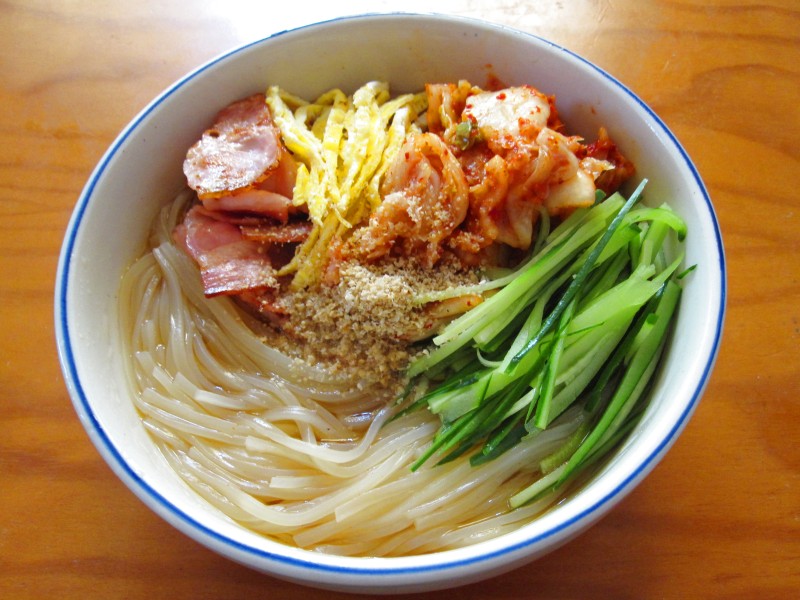 夏の間ずっと、奥の方で出番待ちしていた、冷麺の袋と目が合った。