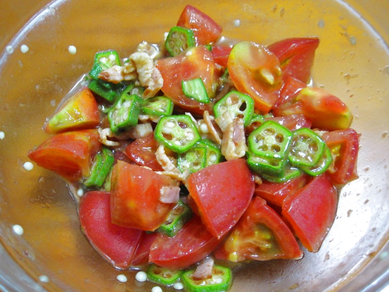 ↑トマト・オクラ・ちょっぴりベーコンのサラダ。