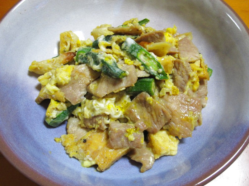 ↑豚肉・オクラ・厚揚げ・ちくわの炒め煮。卵とじ仕上げ。