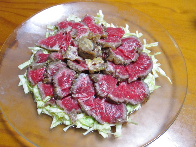 肉を取り出した後の味噌は、キャベツの味付けに使って、皿にしいて。