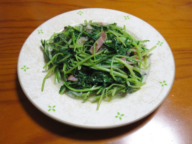 ↑水菜とベーコンの炒め物。