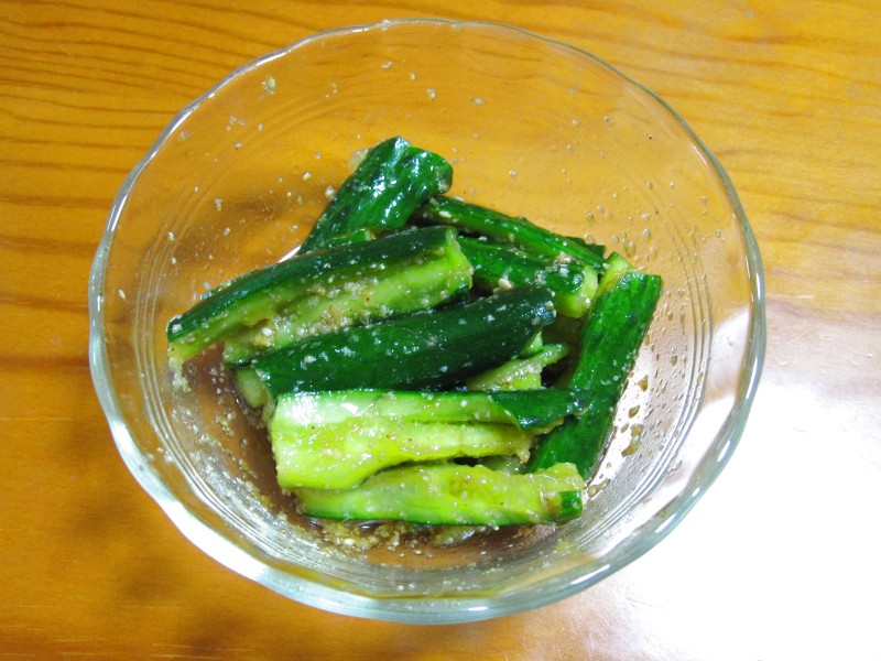 塩をふって、たたき割って、醤油・ゴマ油・すりゴマであえた。