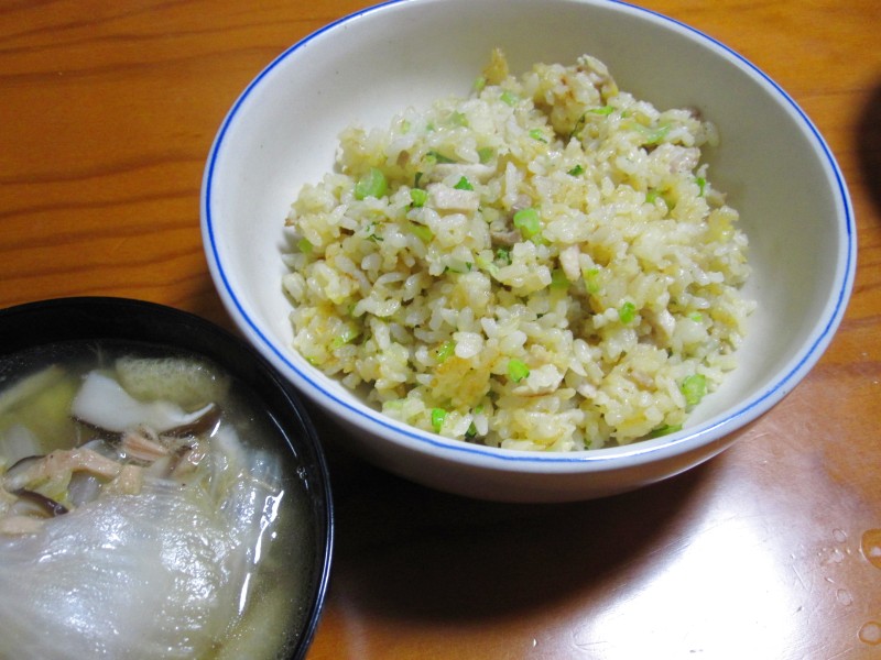 チャーハンには、昨日の豚肉のマヨあえをきざんで入れた。