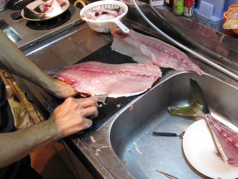 ↑台所では、のぞみさんがブリと格闘。3枚におろされ、皮ひき中。