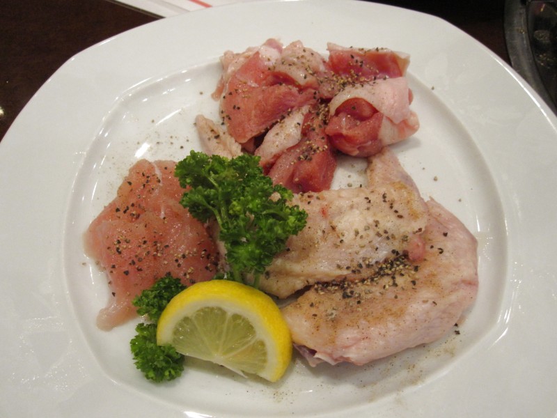 ↑続いて、盛り合わせ肉がドドーンと。サンチュのセットと共に。