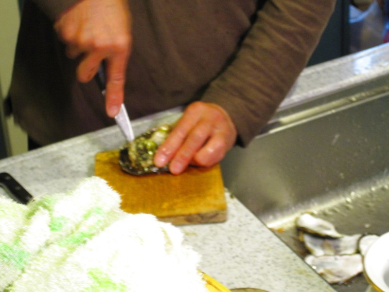 ↑台所では、お義父さんが牡蠣の仕込みをしていた。