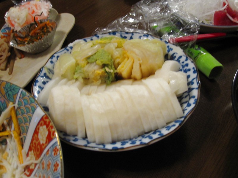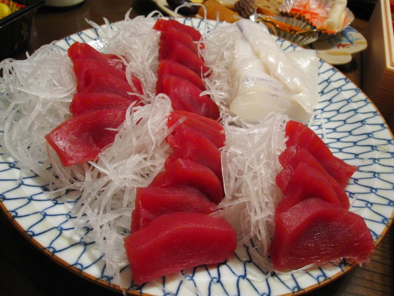 ↑お刺身。まぐろ&いか。お義父さんが切った大根のツマがうまい。