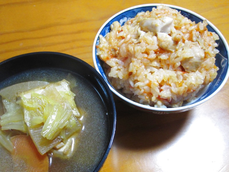 ↑夜ご飯。野菜スープ・炊き込みご飯。