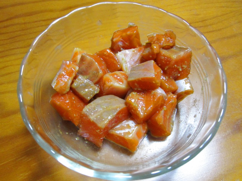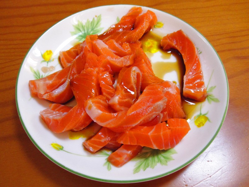 ↑カレーの前に、サーモン刺身。わさび醤油漬け。