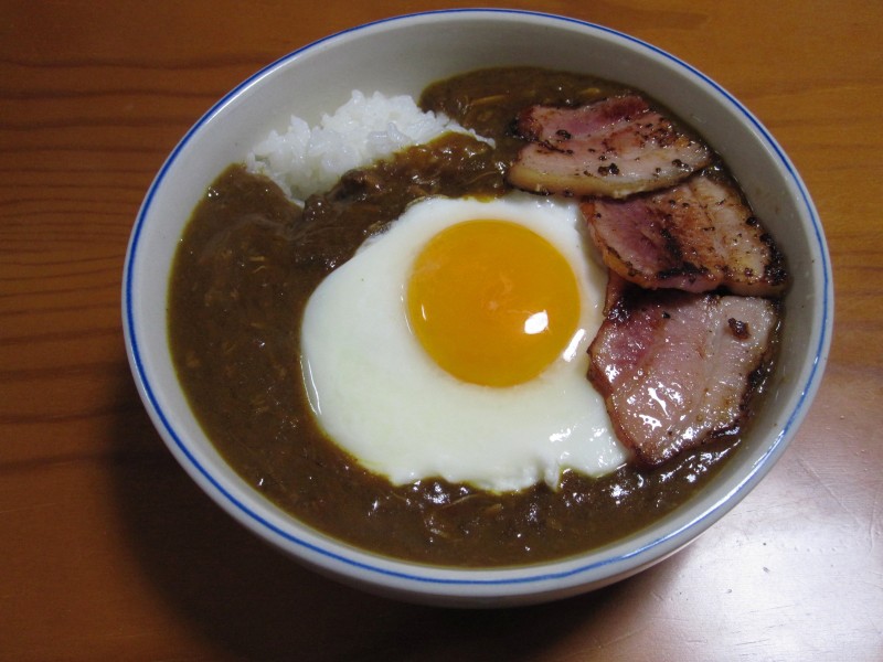 具が無いと寂しいので、今日はベーコンエッグをトッピング。豪華。