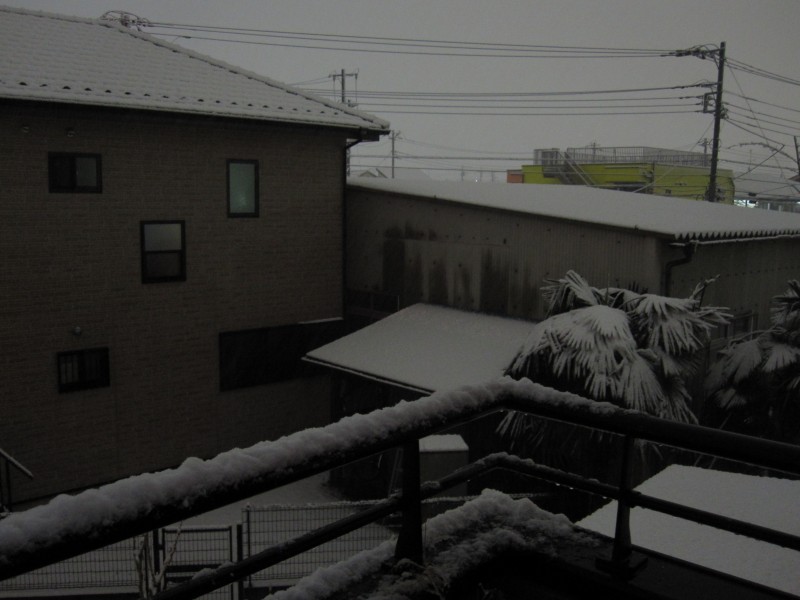 ベランダから外を覗いたら、うちの方も雪になっていた。