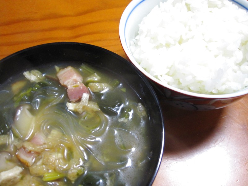 春雨スープは、ベーコン・しいたけ・油揚げ・ホウレン草を入れた。