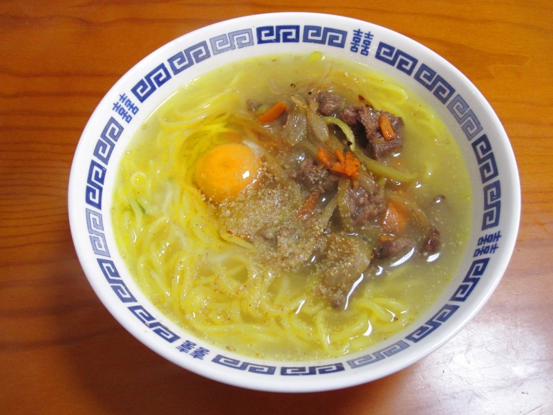 袋ラーメンの塩味のやつに、肉野菜炒め・玉子・ゴマをトッピング。