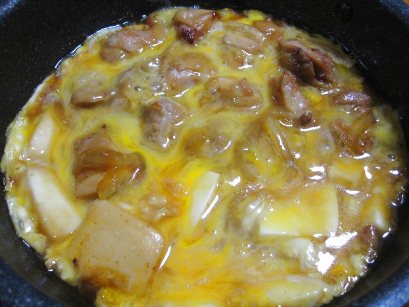 小鍋で作った親子丼の具っぽいのを、そのまま食卓へドーンと。