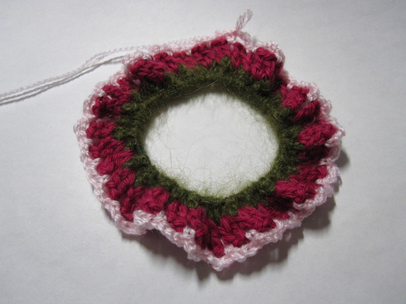 昨日編んだ茶・白・水色のシュシュと色違いで、ピンクバージョン。