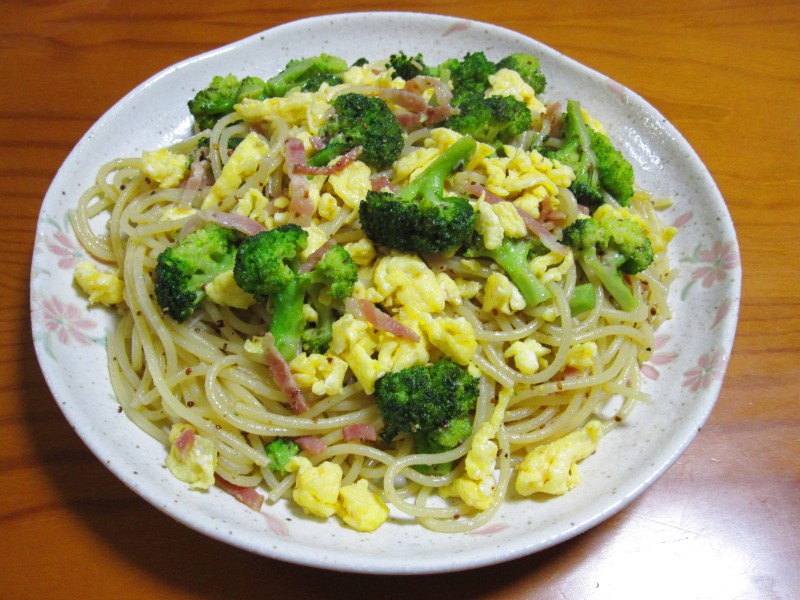 ↑ブロッコリー・ベーコン・いりたまごのスパゲッティ。